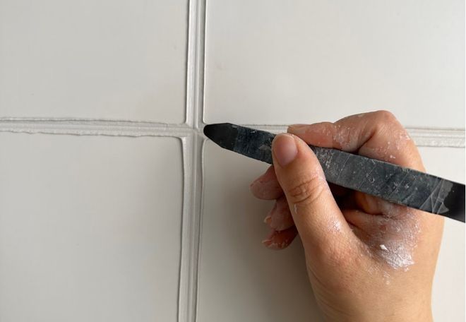 他们选择与瓷砖搭配的颜色,清理干净砖缝后,就像写字一样,描绘这些缝隙。