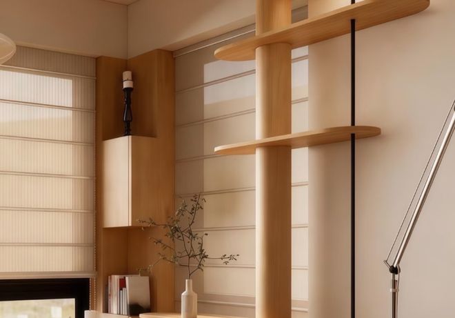 可是,担心砖砌或者是轻钢龙骨占用空间。其实并没有那么复杂,我们可以定制实木的架子,在框架上设计壁龛或者是隔板,既美化,又能增加收纳。