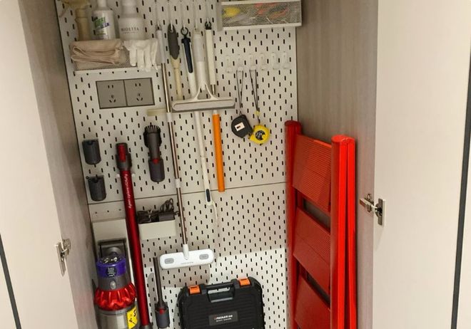 大家也不用为这些清洁工具头疼,其实只需要在一个合适的位置,定制一个3~40厘米深的窄柜。在展柜的内部配上洞洞板或者挂钩。
