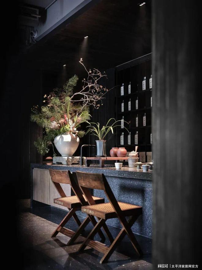 在“一见・茶事”的商业空间中,设计没有为了凸显茶室风格堆砌茶席、字画等符号,而是让设计隐于细节。烧杉木从壁炉延伸到门扇、吊顶,与黑色水磨石地面形成统一的素净色调,仅用壁炉火光增添暖意;昌迪加尔椅的藤编工艺、石雕貔貅的古朴质感,都不是刻意摆放的东方元素,而是自然融入空间的生活物件。这种无设计感的表达,既减少了多余装饰的材料消耗,又让顾客在松弛的氛围中专注于茶事本身,避免了风格化设计带来的审美疲劳。