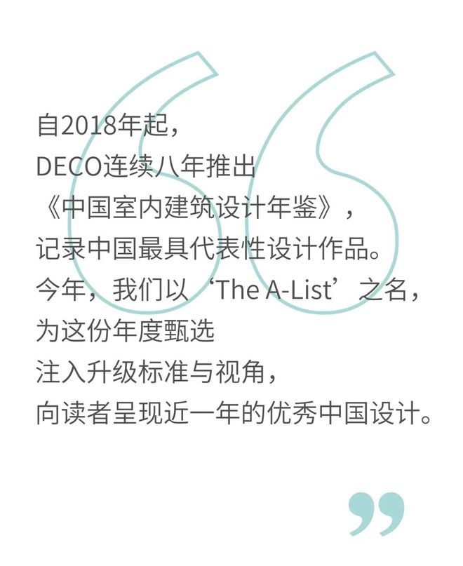 自2004年于中国创刊以来,《家居廊ELLE DECORATION》已陪伴中国设计与生活方式领域走过21年。自2018年推出《中国室内建筑设计年鉴》,已持续八年记录中国最具代表性的空间作品。今年,这一年度项目迎来全面升级,以“The A-List”之名,为这份年度甄选注入全新的标注与视角,旨在从国际视野发掘本土创造,聚焦一年内最具引领意义、已在中国真实落地的室内建筑项目。在通过作品呈现设计美学表达的同时,也为热爱生活、关注空间的读者提供灵感参考与生活提案。