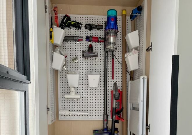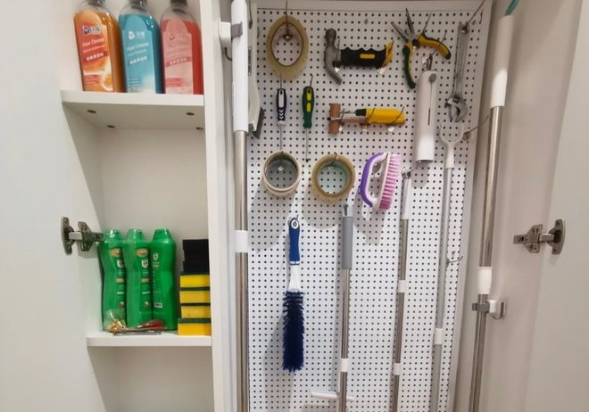 大家也不用为这些清洁工具头疼,其实只需要在一个合适的位置,定制一个3~40厘米深的窄柜。在展柜的内部配上洞洞板或者挂钩。