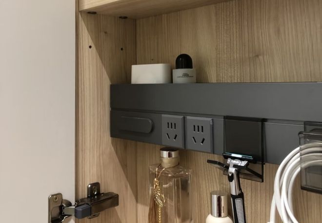定制的镜柜内可以集成插座,这样可以方便电动牙刷,剃须刀充电。侧面可做抽纸口,美观又好看。底部装灯带,既能补光,又能营造氛围。
