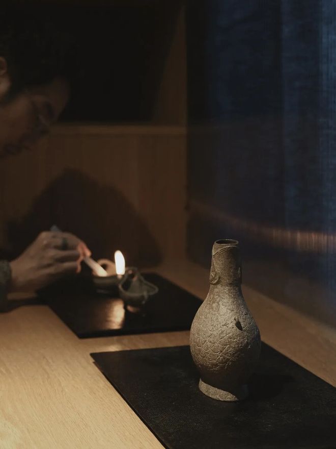 作品将自然纹理作为重要的视觉特征,源自艺术家长期对自然中“被时间侵蚀之物”的观察:风化后的石皮、泥土的裂缝、被雨水打磨后的粗粝曲面……这些“非人工形态”:如不规则的折痕、偶发的塌陷、不均匀的肌理、不对称但自然的结构等被他融合进器物创作之中,使作品呈现出一种“时间性”的视觉表达,静谧、直接,带着“被自然托住”的轻盈。是从时间里“溢出”的碎片,亦邀请来者在微光中停下、靠近感受那些未被命名的形状与情绪。