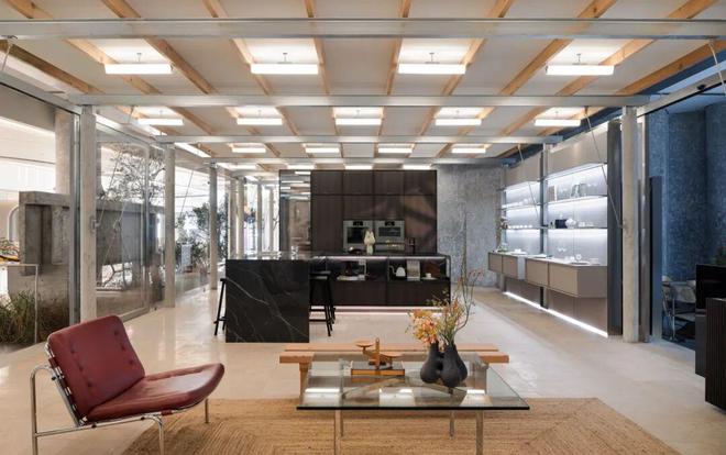全新的中国旗舰展厅设计灵感源自建筑大师密斯·凡德罗的范斯沃斯住宅——那座坐落于福克斯河畔的玻璃建筑,以极简的几何构成、通透的钢架与光影交织的空间而闻名。设计师汲取其“少即是多”的精神,提出“引自然入境、重塑奢华定义”的空间哲学。在设计中,Goldreif尝试模糊展厅与生活场景的界限。这里不仅是产品展示的场所,更是一个能感受到生活气息的场景化空间。自然、光影与工艺在此交融,每一处细节都服务于人本体验。