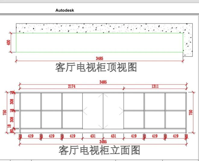 半高柜两边做开放格,搭配上底部的收纳筐,可以用来收纳书籍、玩具和零食;中间做对开门柜,则隐藏了电视机线路和路由器设备。附上我家的图纸供参考。