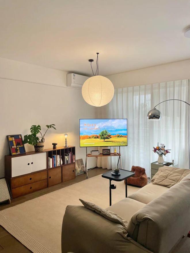 网友@Joy家:我在装修时压根就没考虑过电视墙,一组中古风置物柜+可移动电视支架,就是我最理想家的样子。