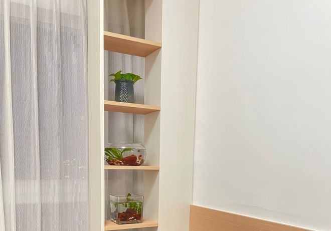 可是,担心砖砌或者是轻钢龙骨占用空间。其实并没有那么复杂,我们可以定制实木的架子,在框架上设计壁龛或者是隔板,既美化,又能增加收纳。