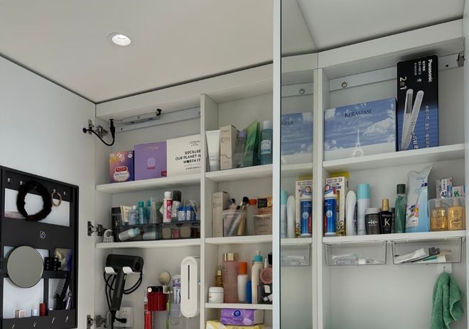 镜柜建议采用二八原则,20%开放格用来放置常用物品,80%封闭空间用来隐藏杂物。