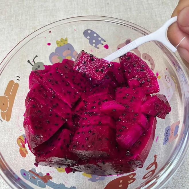 当然,我们在吃水果丁时,也可以用牙线代替叉子,将小块水果轻轻挑起,干净又卫生。