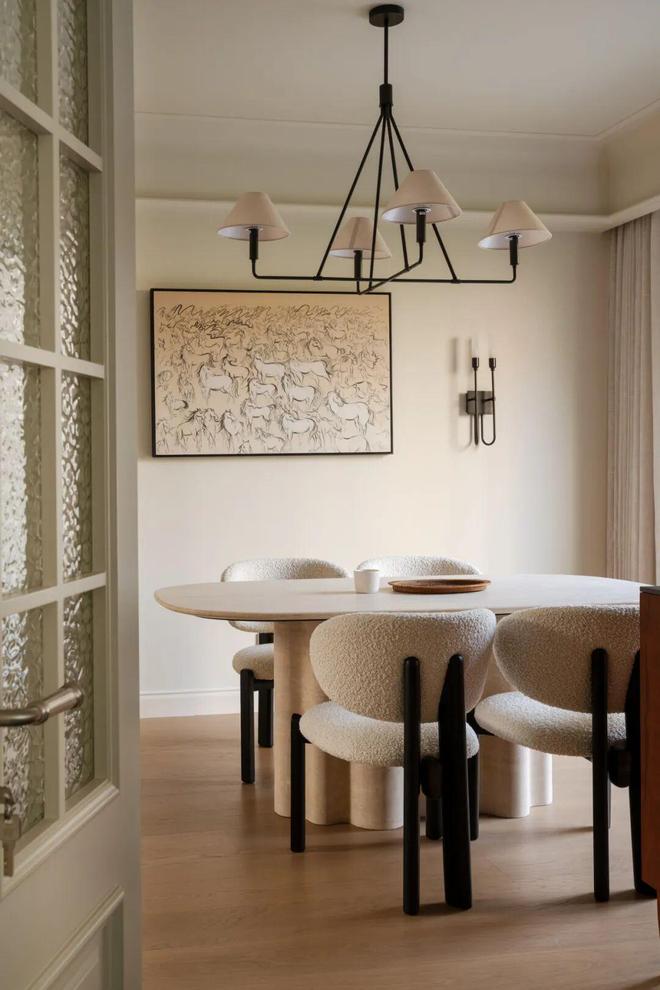 考虑到餐厅面宽有限,设计团队选用了小巧的洞石餐桌,尺度合宜,与全屋法式复古的氛围协调。对称安装的壁灯与挂画遵循对称美学,赋予空间稳定的秩序感,让餐厅真正成为凝聚家人情感、承载日常用餐仪式感的核心生活区域。