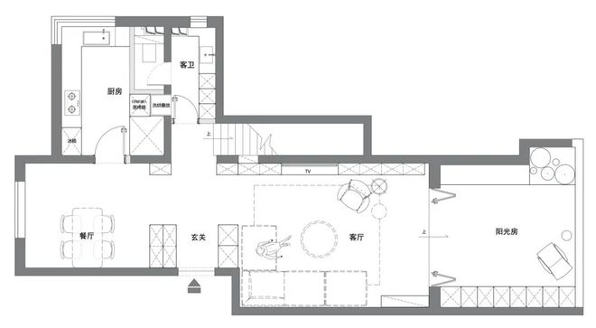 南向客厅是本次改造的核心亮点之一。拆掉二楼加建的书房后,挑空结构被完整释放,客厅得以拥有南向二楼落地窗和一楼阳光房带来的充沛自然采光,光线毫无阻碍地涌入室内,让整个空间显得开阔明亮,彻底摆脱了此前的压抑感。