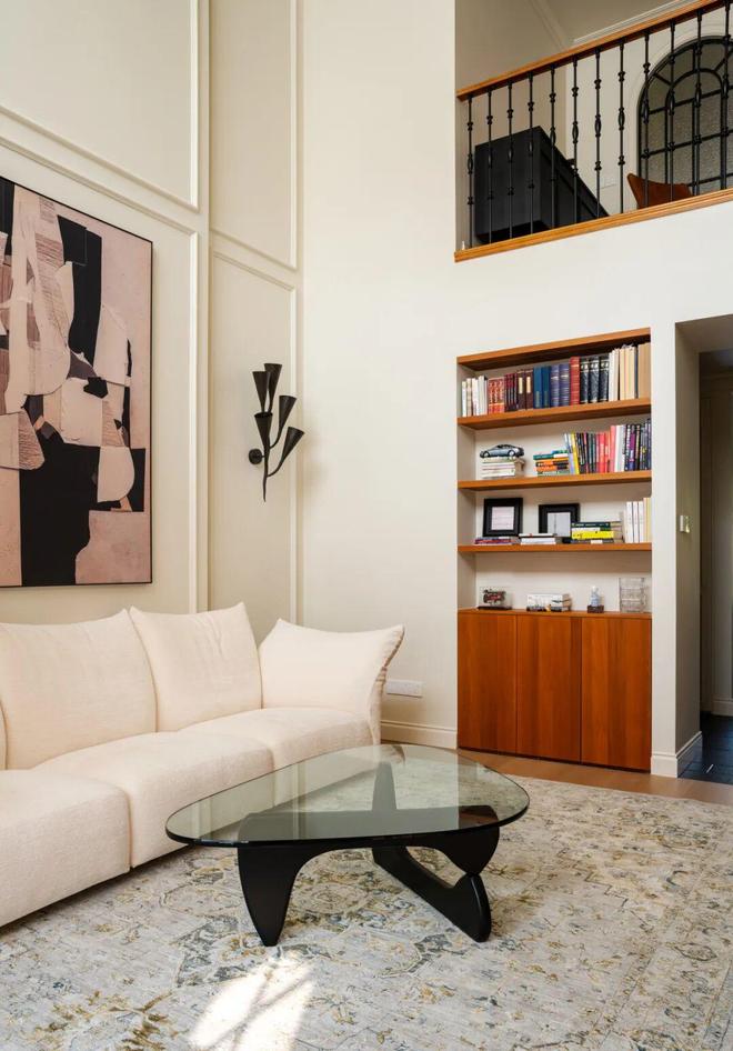 整面柜体采用分段式设计,下部选用木色,上部搭配白色,既降低了视觉重心,也让整个空间更显沉稳大气。柜体下半部分的封闭柜门,能够将常用的零散物品妥善遮挡,避免杂乱外露,让家始终保持整洁有序;而开放格区域,除了用来陈列夫妇二人收藏的旅行纪念品与艺术藏品,更核心的功能是收纳并展示他们日常常读的书籍。