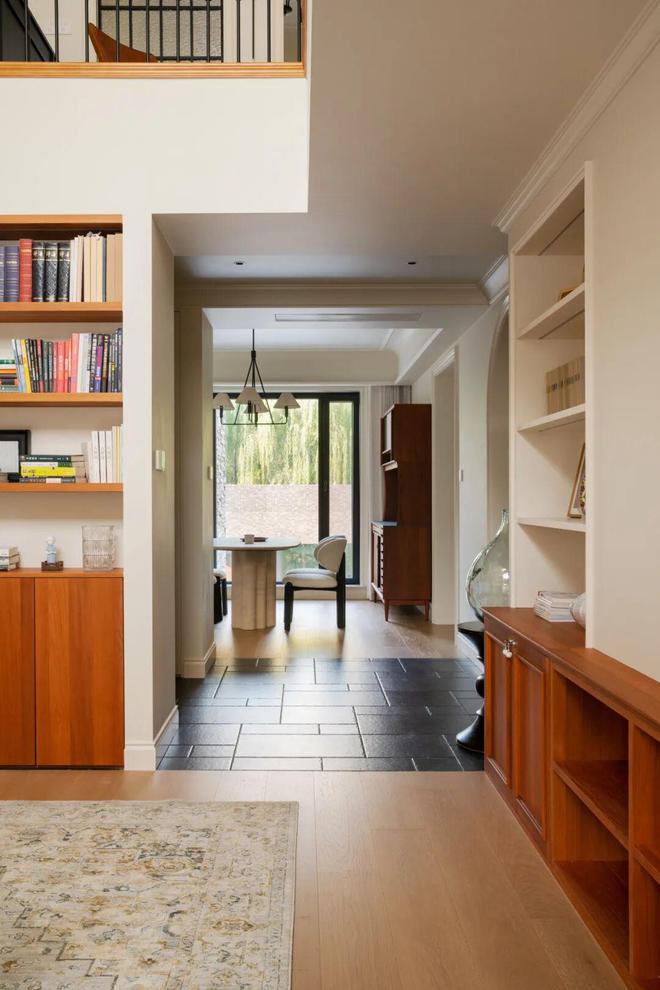 在增加玄关柜的同时,设计师还在其背后为客厅多做了一组书架,既能实现书籍的就近收纳,方便随手取用,又能以开放式陈列的方式呈现,无形中吸引家人更愿意在此区域停留、静坐,促进彼此间的交流互动。