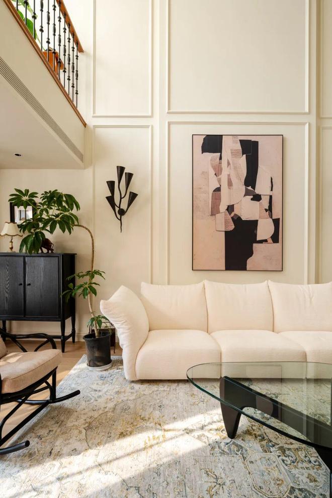 扩大挑空后,一楼也为更大的沙发背景墙释放出空间。改造团队用石膏板和PU线打造出造型墙,左右对称布局的壁灯与主灯搭配,既提升了客厅的气场,又丰富了夜晚的光线层次,让空间在不同时段都能呈现出舒适的氛围。沙发左侧角落增设了一组黑色柜子,用来摆放叔叔阿姨旅行带回的摆件、挂画以及古董灯,增添浓厚的艺术氛围与生活气息。