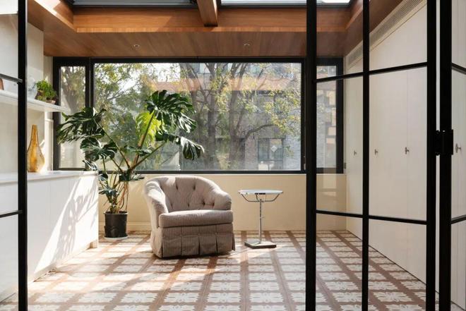 改造后的阳光房在功能上更为复合与丰富,成为屋主养花、做瑜伽、晒太阳、洗衣晾晒与集中储物的全能空间。顶部采用高质量电动开启窗,搭配中央空调系统,确保这里四季温度宜人、通风透气,即便阳光强烈照射,房间也不会闷热。