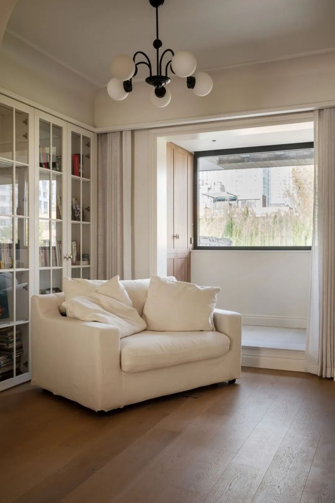 由原来的和室改造而成的半开放书房,配置了玻璃门书柜,用来收藏经典书籍,搭配单人沙发,营造出沉浸式的阅读体验,让屋主可以在此静下心来享受阅读时光。