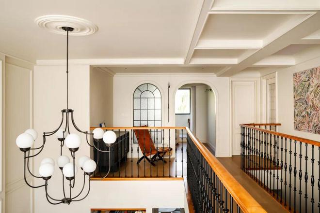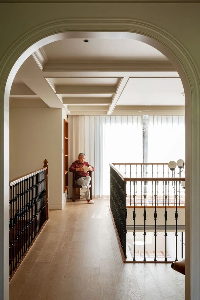 二楼的护栏扶手呼应整屋法式复古格调,采用柚木搭配黑色铁艺栏杆,勾勒出精致的法式骨架,同时顶部悬挂极具仪式感的大型主灯,不仅成为空间的视觉焦点,更巧妙串联起上下两层空间,强化了整体的纵向联系,也让一楼与二楼的互动更为紧密,阿姨平时在二楼时,可随时透过挑空区域与一楼的叔叔交流,让二人世界的陪伴不被空间阻隔。