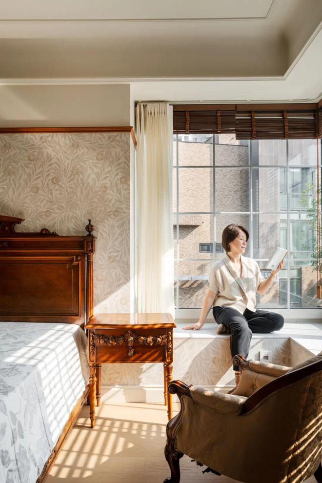 最佳窗景+充足阳光,让主卧前的小走廊摇身一变成为隐秘阅读区。这里也是阿姨的瑜伽角。一人读书,一人瑜伽,日常情感交流更为频繁,空间的使用效率得到显著提升。
