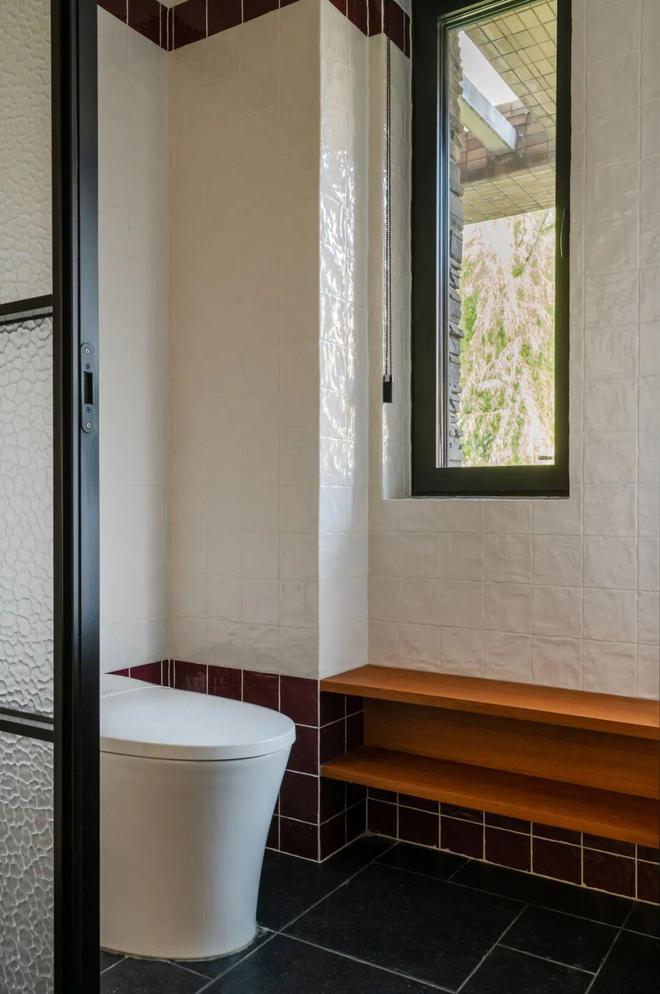 独立马桶间净宽达1.2米,屋主转身、起坐都能舒展自如,丝毫没有局促之感。墙面设置了开放层板,可放置手机、卷纸等物品,必要时也能充当扶手;保留的窗户既保证了通风,也为如厕时增添了自然景观,丰富了屋主的使用体验。