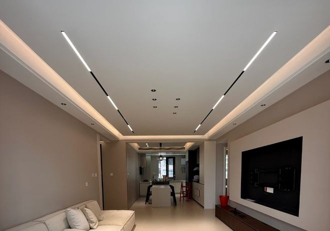 可是,很多人却盲目跟风,放弃了主灯,全屋布满数十甚至上百个嵌入式的射灯、筒灯,磁吸轨道灯和灯带。