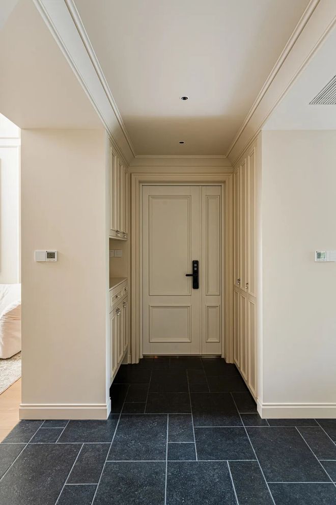 位于客餐厨三区交汇处的玄关,地面采用了与其他区域不同的黑色莱姆石,既清晰界定了空间,又承担了落尘区的功能,更方便清洁打理。设计师在这里打造了一个过道型玄关系统:入户左右两侧新建了两组长1300mm、深670mm的储物模块,进行精细分区收纳。左手边为综合储物区,用来挂置长衣外套、收纳杂物、隐藏电表箱,右手边则是书柜+鞋柜为一体的双面柜,分区合理、实用,大大提升了生活的便捷性。