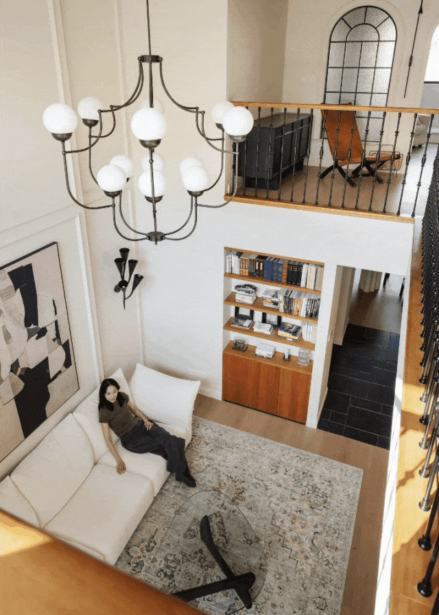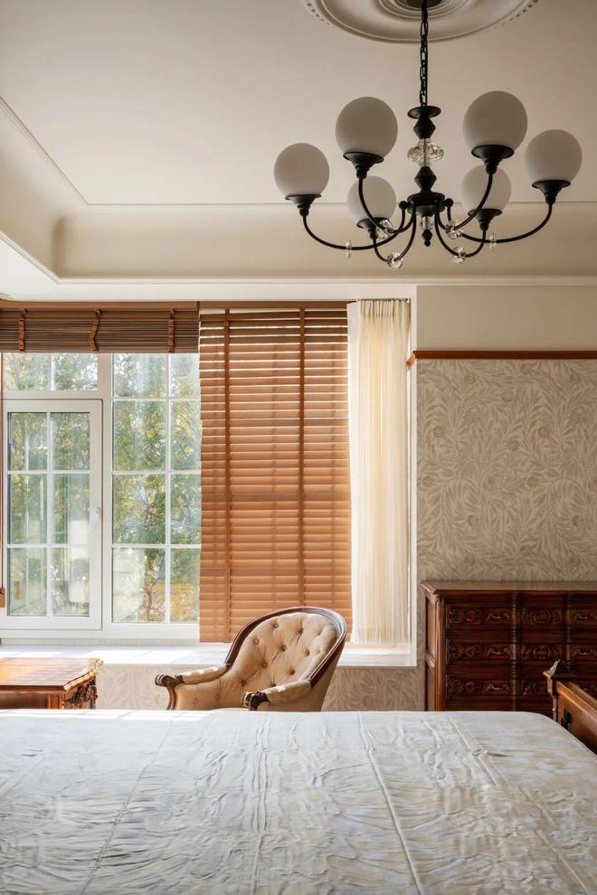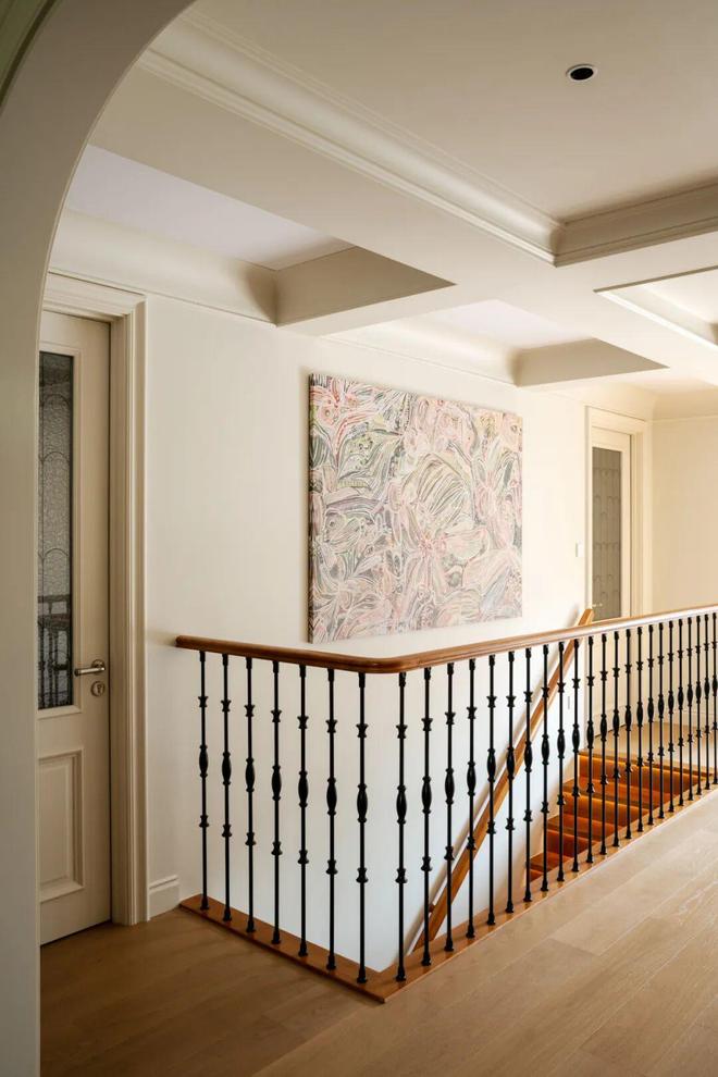 二楼的护栏扶手呼应整屋法式复古格调,采用柚木搭配黑色铁艺栏杆,勾勒出精致的法式骨架,同时顶部悬挂极具仪式感的大型主灯,不仅成为空间的视觉焦点,更巧妙串联起上下两层空间,强化了整体的纵向联系,也让一楼与二楼的互动更为紧密,阿姨平时在二楼时,可随时透过挑空区域与一楼的叔叔交流,让二人世界的陪伴不被空间阻隔。