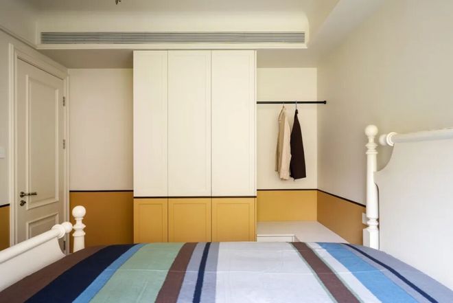 原门洞被封起来、改造成柚木壁龛,用来放置阿姨的瑜伽运动装备;背面原本位于床尾的门洞也被封上,打造满墙通顶大衣柜,同时有效隔绝走廊噪音,提升了卧室的静谧性。所有柜门采用同一款烤漆,避免出现不同色调的白色,让空间在视觉上更为协调。
