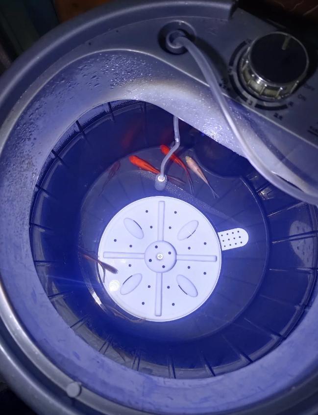 网友@假老练:看到别人用旧冰柜养鱼,自己就用旧洗衣机试了一下,发现果然可行。想加水就打开洗衣模式,想换水清理鱼便,就打开脱水模式,真正实现了全自动模式。