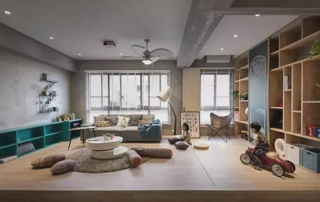 大客厅全都打成地台,即便房间打通也不用担心没有地方睡觉了,孩子的活动空间也更宽敞,在棚顶安装一个滑道,一扇折叠门,就能将客厅和卧室分开,一物多用,平时当休闲区、活动区客厅,关键时刻还能当书房、客卧!简直方便极了!