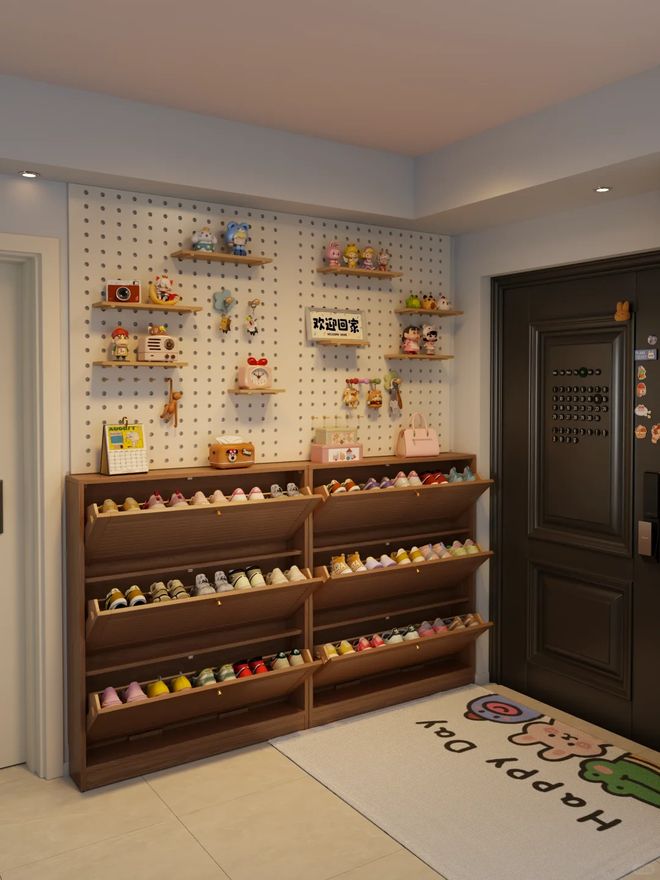 市面上专门为小户型设计的超薄鞋柜(厚度只有15 - 18厘米)是非常好的选择。翻板式设计的鞋柜采用斜插结构,一层可以放2双鞋,大大节省了空间;挂墙式开放格搭配帘子,既能挡住灰尘又不妨碍通行;带轮子的小推柜更加灵活,不用的时候可以完全藏在门后,实现“隐形收纳”。有业主分享说,自己家在进门的墙面上安装18厘米厚的鞋柜时,特意预留了一个坐凳的位置,换鞋变得轻松又方便。