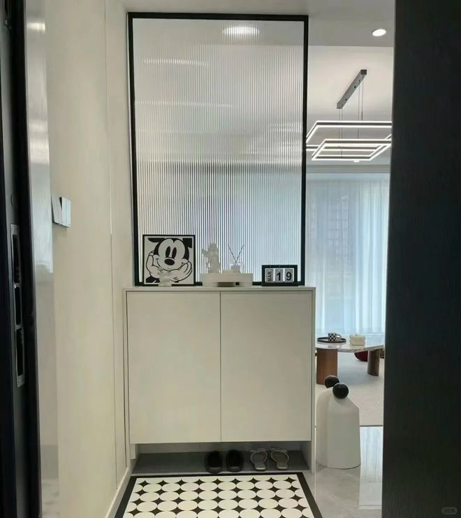 3.巧妙运用软隔断:用半墙柜体搭配长虹玻璃作为隔断,既能保持空间的通透感,又能划分出一个独立的入户区域,同时还能保护隐私。