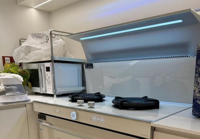 1)语音激活升降系统。打开调料区,只要语音发出指令,墙面自动展开,呈现分类整齐的调料架,是不是很高级呢?