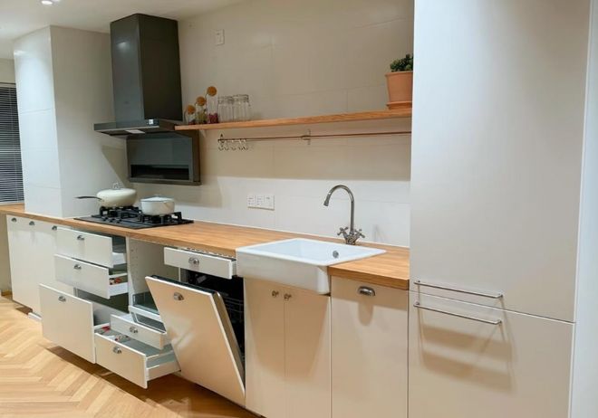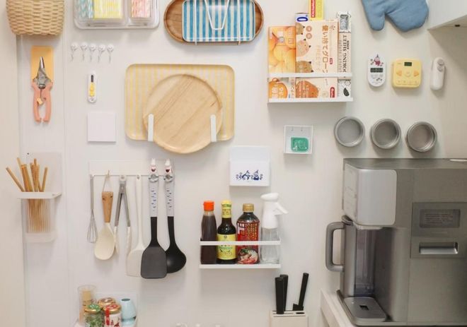 我发现上海一处人家的120平米的公寓,采用了这种设计,跟他交流得到的反馈是:可以根据季节和烹饪习惯调整墙面布局,春天烘焙工具放在顺手的位置,夏天换成冷饮制作区,厨房活了,不再是一个固定不变的盒子了。