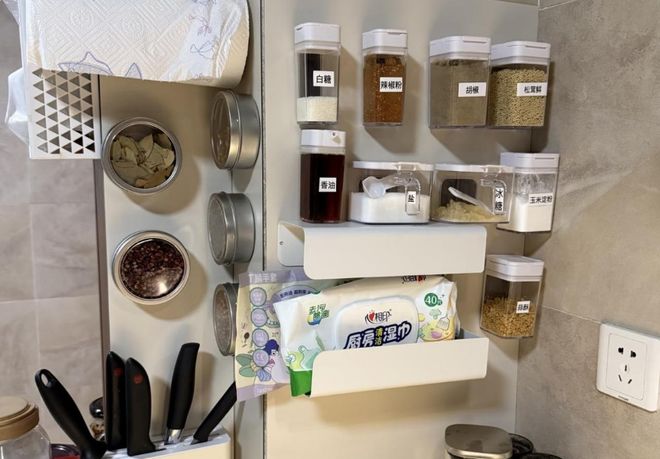 磁吸式面板墙面。在墙面覆盖磁吸性的背板,收纳组件均可以随机吸附、移动和组合。在墙上挂锅就能挂锅,想挂刀具就挂刀具,简单调整即可以实现。