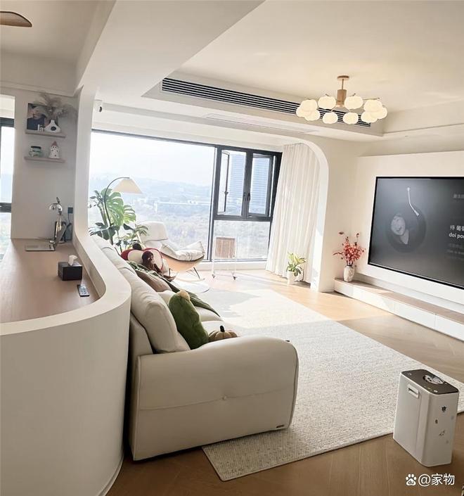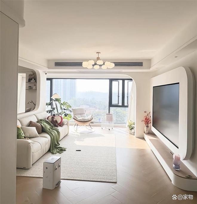 一是觉得这满墙电视柜会让人养成囤积的毛病,二来也是因为怕这电视柜过厚,影响整间客厅的视觉观感,于是乎便做成了现在这样的造型电视墙。