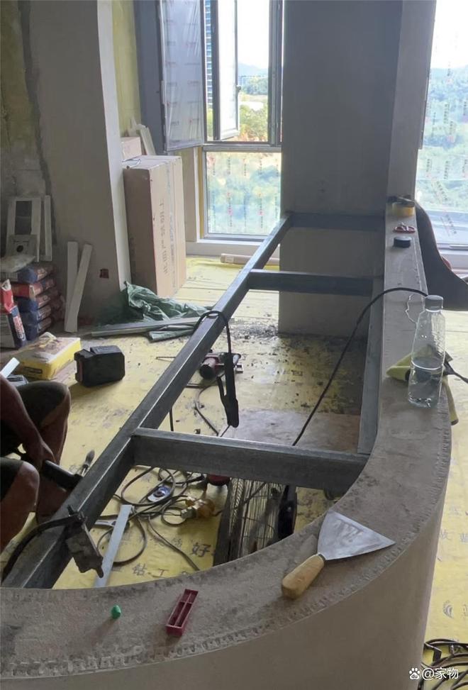 或许有人担心这桌面较长容易沉降,但在装修时,这户人家就考虑清楚了,不惜成本用水泥砖砌+钢架当做桌面骨架,安稳牢靠,完全不用担心桌面沉降,最为适合这种双人或多人的长桌面使用。