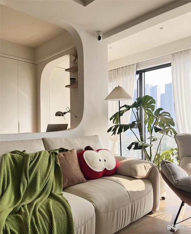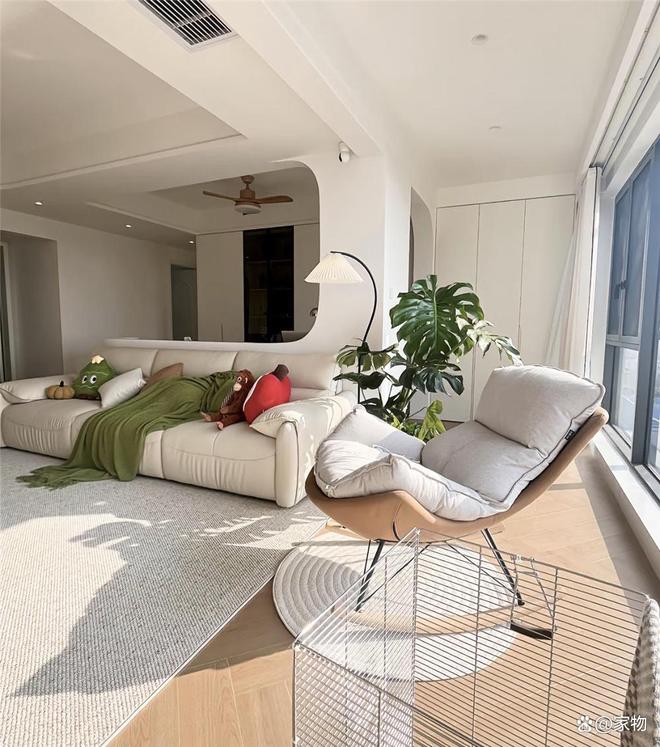 沙发连着阳台,旁边再摆几株绿植、放上张单人沙发,白天阳光进入家中,更让这间客厅变得温馨宜居。
