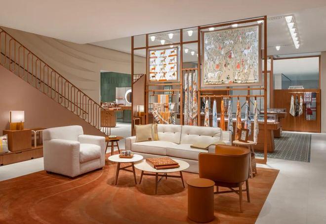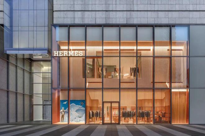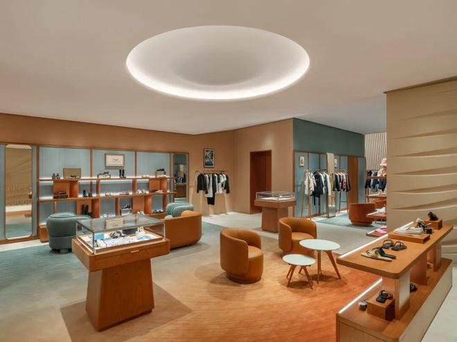 爱马仕长沙国金中心专卖店迎来拓新启幕,该专卖店于2018年首度揭幕,如今以全新室内空间礼赞在地文化与创新精神,于两层敞阔空间悉数呈现爱马仕十六大产品部类。双层挑高玻璃外立面内侧,一座形似巨型织机的装置赫然矗立,商场内的另一入口覆以铜色瓷砖,以弧线造型呼应城市传统屋脊。 移步主入口内,温暖的琥珀色与蓝色光韵交织,勾勒爱马仕标志性藏书章图案。