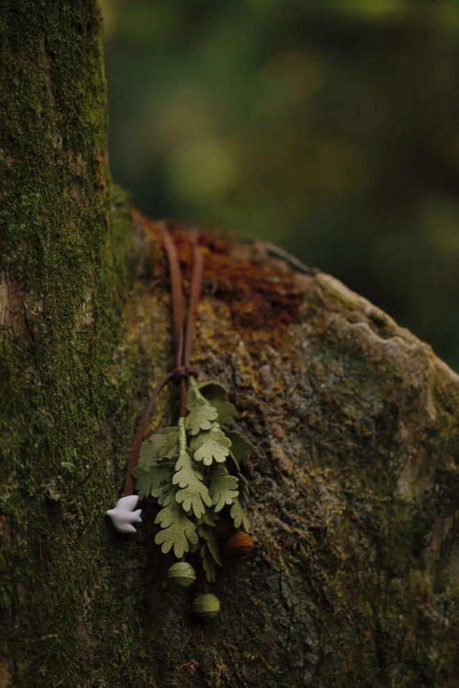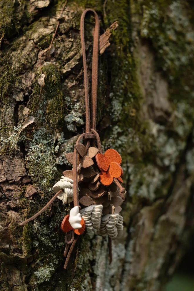 “椋鸟来信”是椋木“闻”的第一个作品系列,包含苔藓被子、鸭先知、树下红茶、深林低语、书房之扉、熟透了、松果落霜、蓝丝绒8种香气,以草木、花果和木质调为主。8款“香氛油”不追求持久浓烈,而是捕捉瞬间的综合感受。 椋木将织物“花串挂件”与香氛结合,每只手工缝制的花串都是椋鸟的“香气之信”。用来制作花串的奥司维Ultrasuede®面料是一种源于植物的人造革,它模仿了皮肤或草叶的触感,本身带有淡而微妙的麂皮味道,细腻的色彩恰好表达了这些看似平凡却深奥的小植物。当香氛油滴在面料上,最初会产生深色痕迹,但它又会随着香氛油挥发而消散,留下一片淡淡的芬芳。