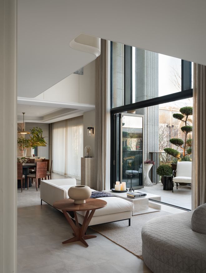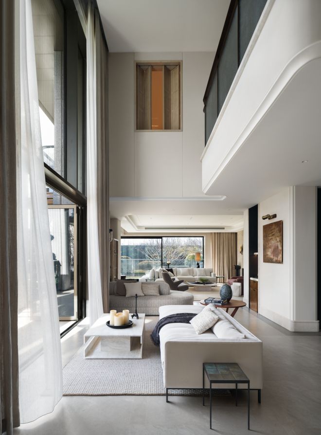 家庭厅的挑空结构衔接了幕墙景观与首层休闲区域。