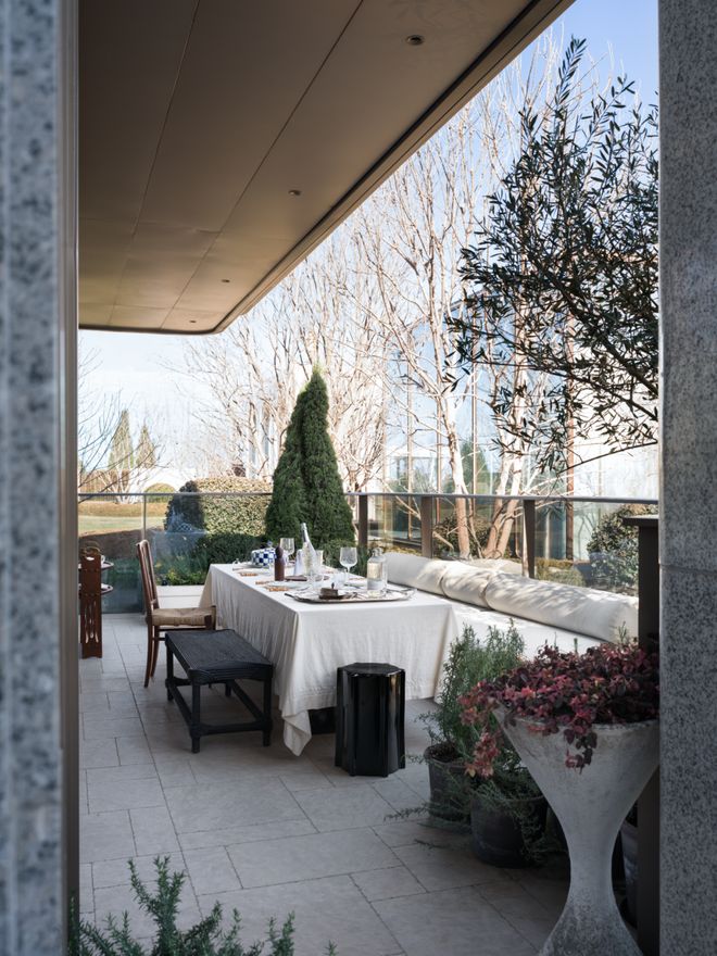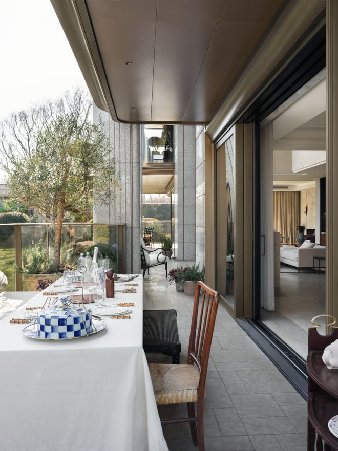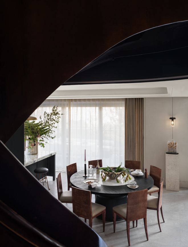餐厅借阳台向外延展,形成一个自然过渡的空间。花园被引入日常视线之中,也让用餐的边界随之打开:清晨的阅读角,午后的停留处,或是夜晚围坐的延伸空间。功能并未被预设,而是在使用中不断变化。尺度的留白,让空间拥有了被重新定义的可能,也为未来的生活方式预留了弹性。