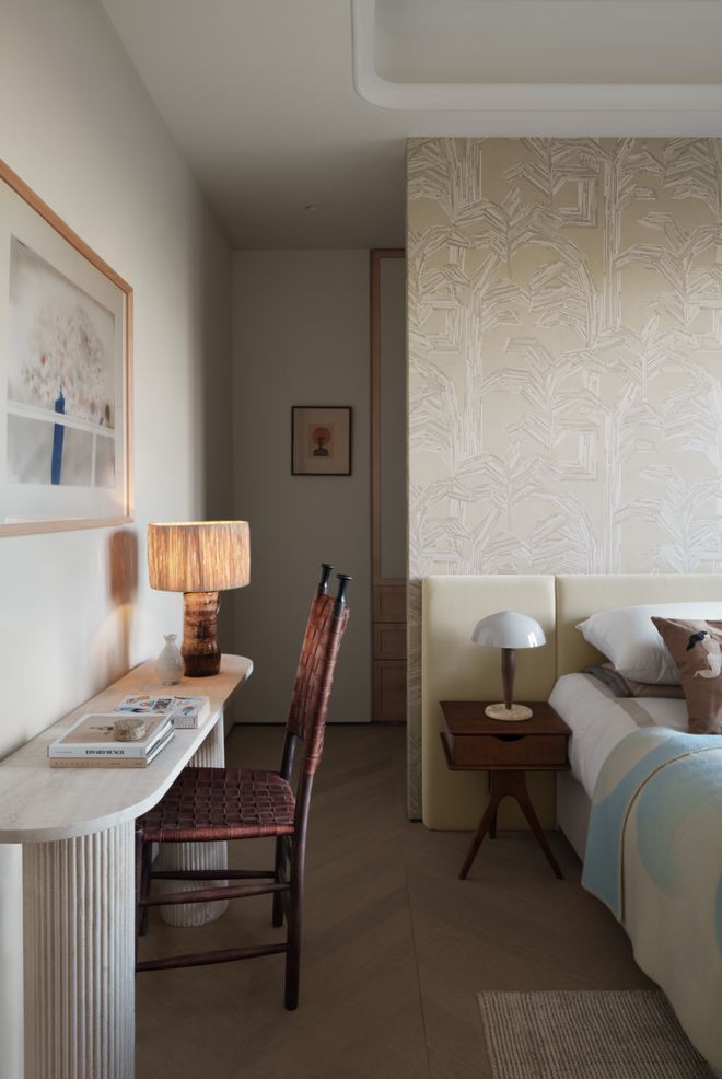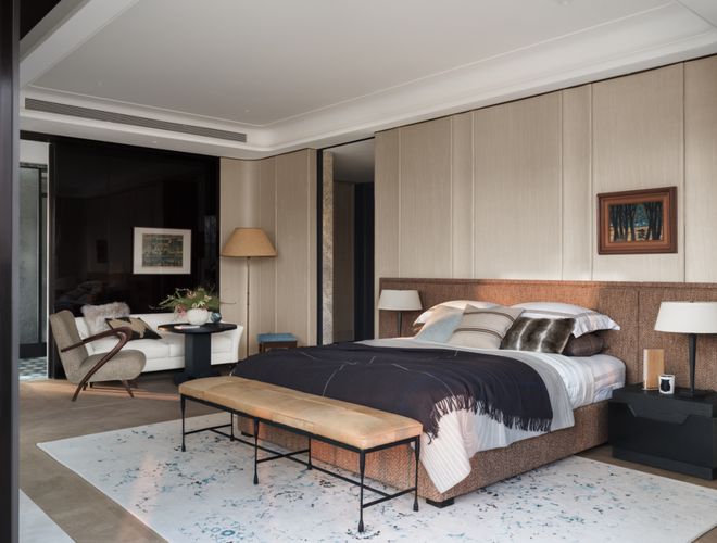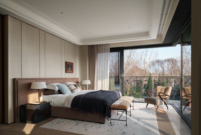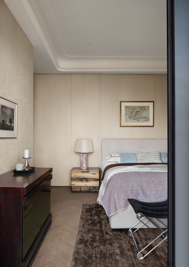 主卧被构建成一个高度复合的精神岛屿,睡眠、阅读与独处被整合在同一套使用系统中。步入室内,空间从入口处的衣帽间开始缓慢过渡,通过动线的折转,将外界的喧嚣彻底阻隔在房门之外,为居住者进入放松状态提供了心理准备。