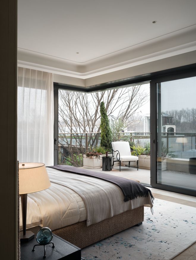 在LSD看来,景观资源的价值不应止于视觉的占有,而应转化为对日常行为的承载。主卧270°超宽尺度的景观阳台实现了室内外界限的消弭,将办公、休闲甚至健身的可能同时引入这片区域。自然不再是挂在墙上的风景,而是随着晨昏更替不断移动的光影背景,让居住者在私属领地内获得了与自然共生的自由。