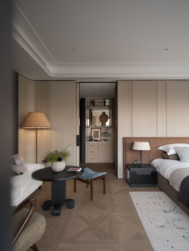 卧室配置参考酒店化的标准,通过步入式双衣帽间与独立玄关的设定完成了生活秩序的分隔。背景墙采用弧形艺术壁布阵列式包裹,细腻的肌理在视觉上建立了温润的屏障。地面铺设的拼花实木地板,将客餐厅的材质语言延续至此。主卫的洄游双动线设计,不仅提升了空间的使用效率,也确保了居住成员在洗漱与更衣过程中的私密与流畅。