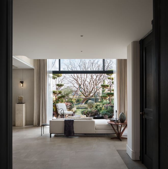 家庭厅的挑空结构衔接了幕墙景观与首层休闲区域。