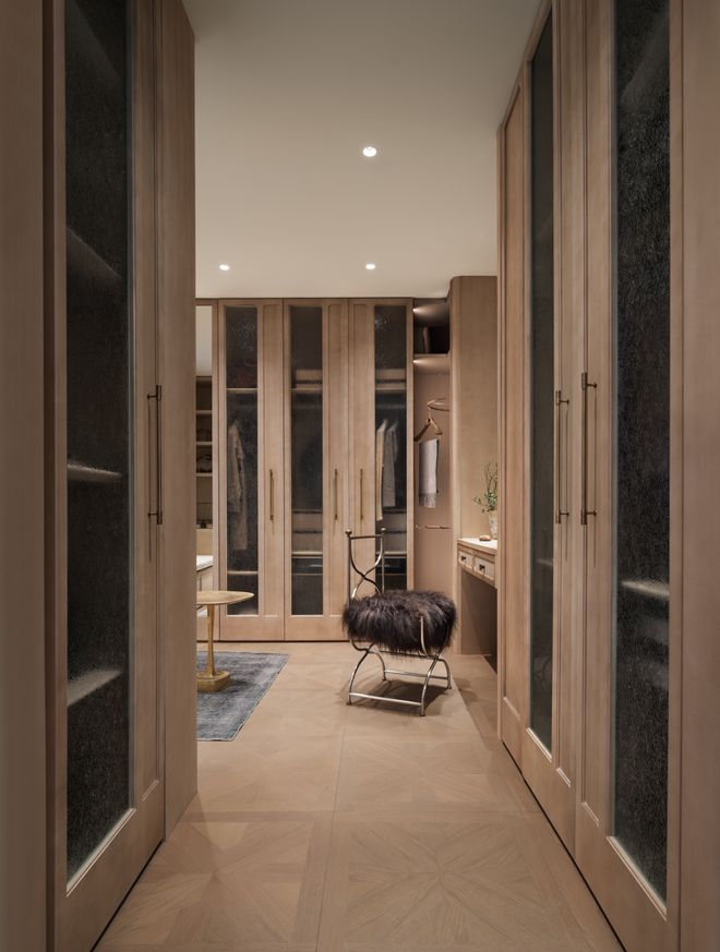 卧室配置参考酒店化的标准,通过步入式双衣帽间与独立玄关的设定完成了生活秩序的分隔。背景墙采用弧形艺术壁布阵列式包裹,细腻的肌理在视觉上建立了温润的屏障。地面铺设的拼花实木地板,将客餐厅的材质语言延续至此。主卫的洄游双动线设计,不仅提升了空间的使用效率,也确保了居住成员在洗漱与更衣过程中的私密与流畅。