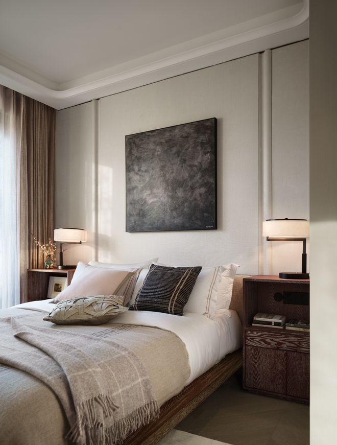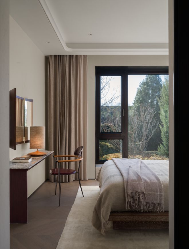 主卧被构建成一个高度复合的精神岛屿,睡眠、阅读与独处被整合在同一套使用系统中。步入室内,空间从入口处的衣帽间开始缓慢过渡,通过动线的折转,将外界的喧嚣彻底阻隔在房门之外,为居住者进入放松状态提供了心理准备。