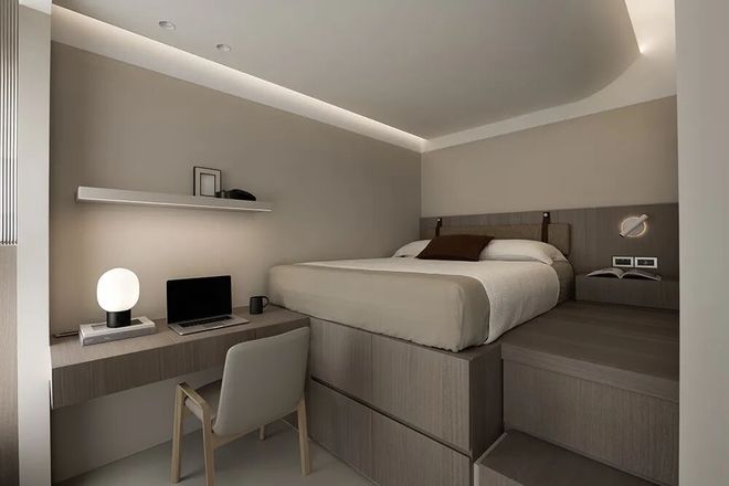 在小巧的区域内透过架高设计,增加垂直收納功能