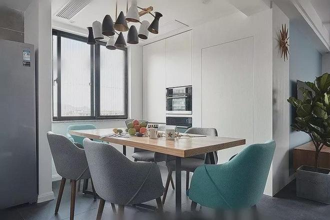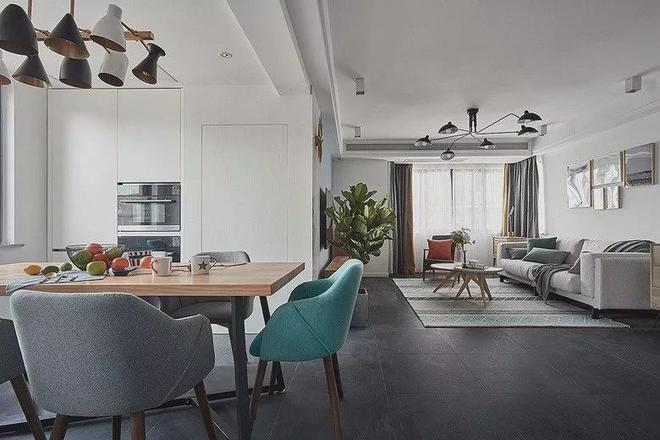 客厅与餐厅相连,开放式的就餐空间,原木风的餐桌与布艺餐椅,顶部黑白相间的吊灯,营造愉悦舒适的就餐氛围。